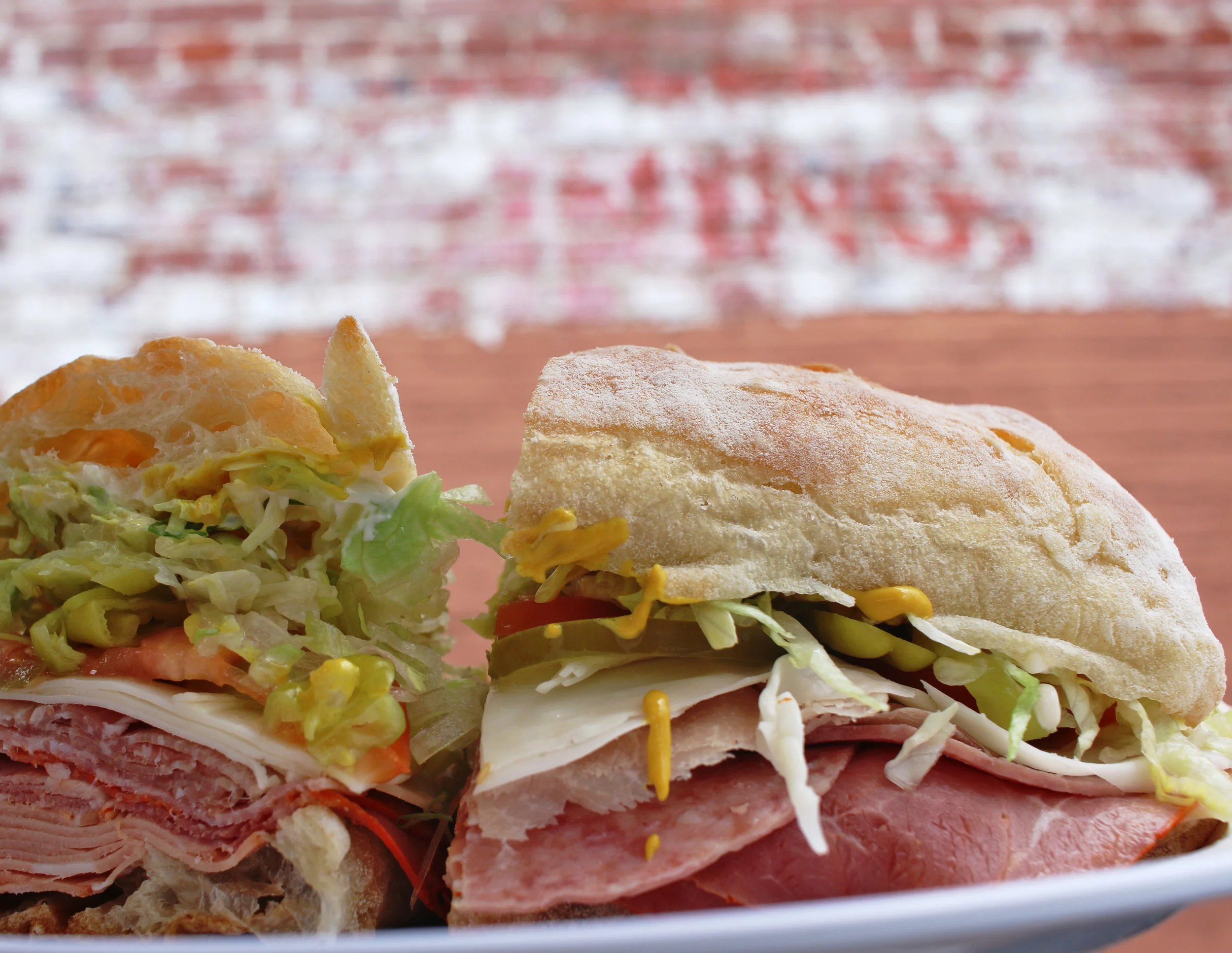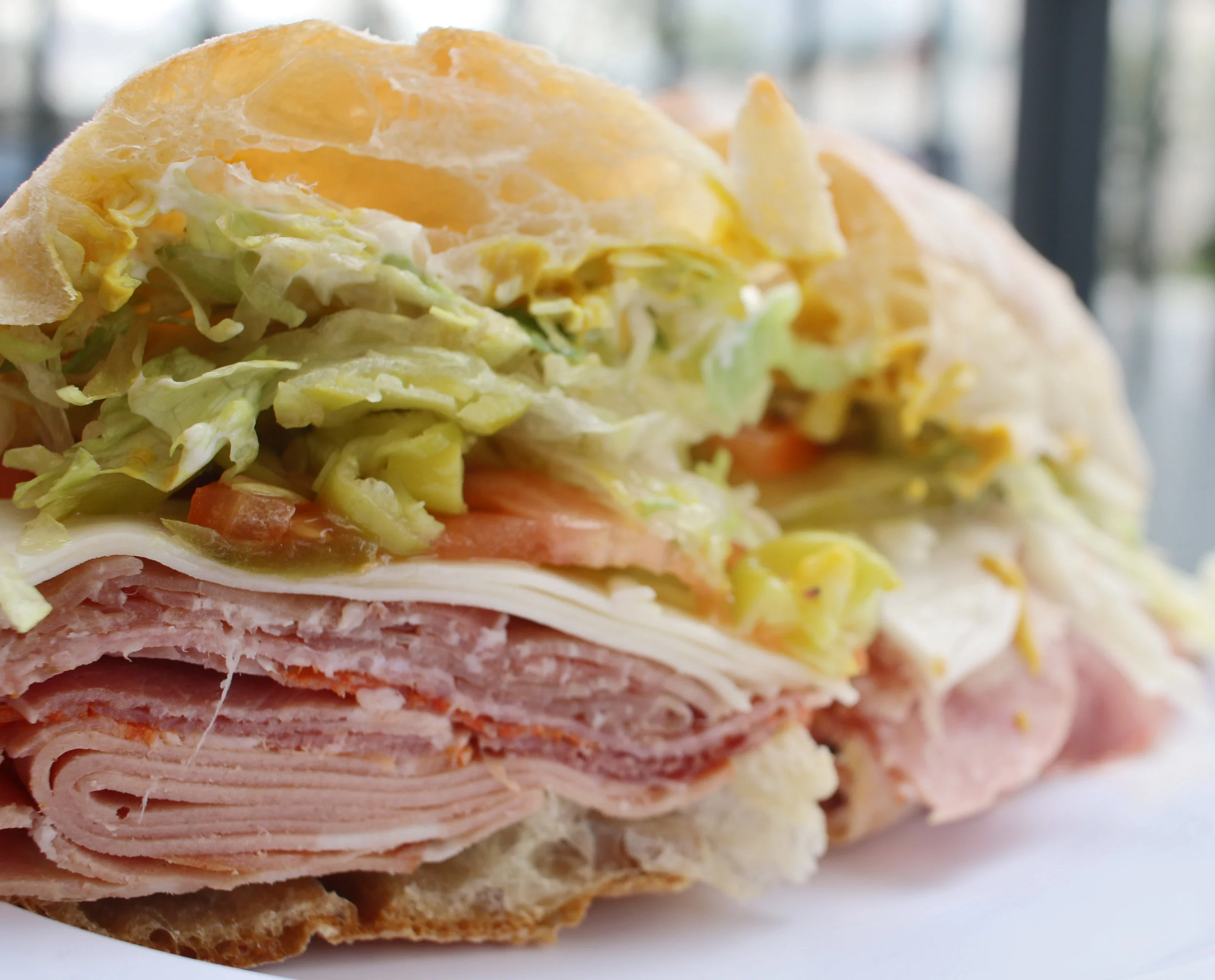 Italaiano : Genoa salami, mortadella, capicola, ham, prosciutto, provolone, lettuce, tomatoes, onions, mayo, yellow mustard, pepperoncini & pickles on a ciabatta roll. (I told you it was huge!)