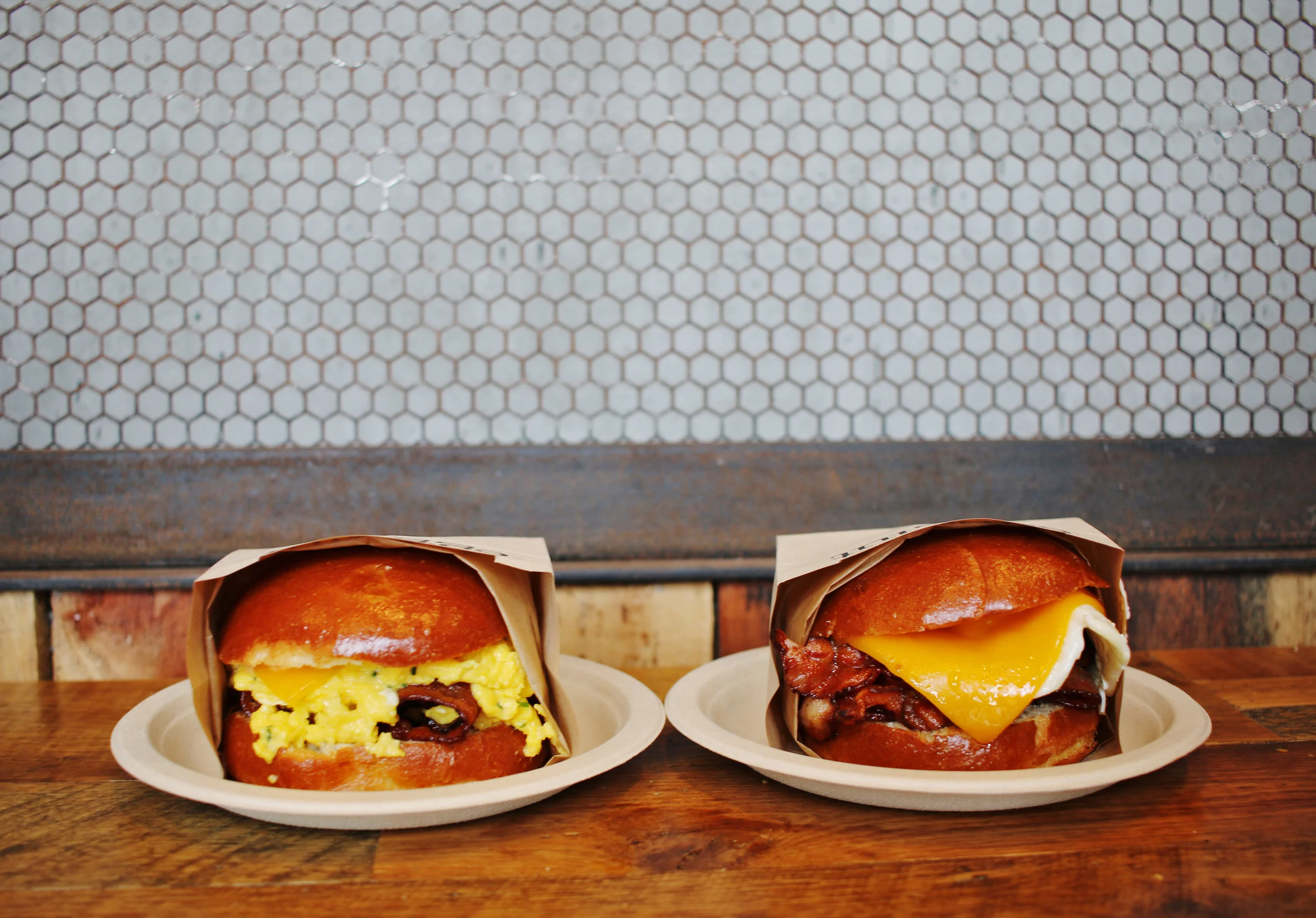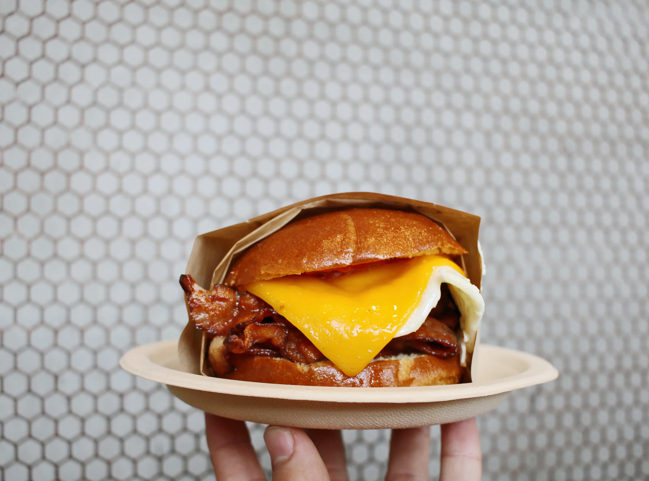 hardwood smoked bacon, cage-free over medium egg, cheddar cheese and chipotle ketchup in a warm brioche bun