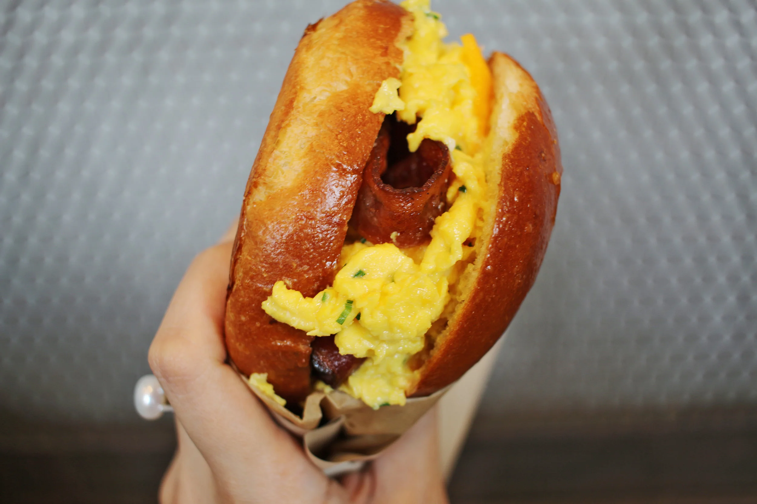 cage-free soft scrambled eggs and chives, cheddar cheese, caramelized onions and sriracha mayo in a warm brioche bun