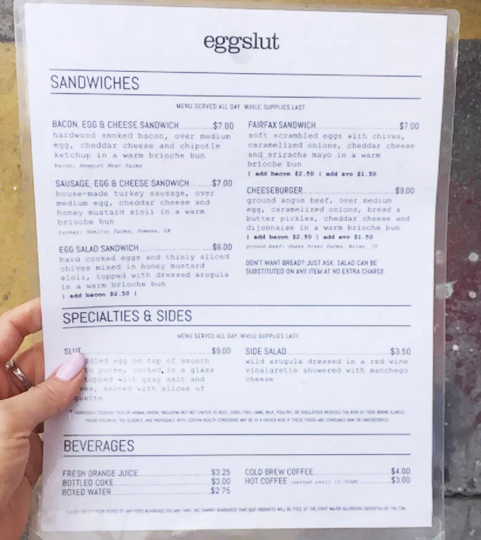 The name alone is what I think draws people’s attention and then the amazing food is what keeps everyone coming back. They have four different locations three being in Southern California and then Las Vegas! I can see this chain expanding even more over the next couple of years based off the fan base and easy quick service. Another great thing about this place is they used cage-free eggs which makes such a difference in quality and taste. I only buy cage-free at home so why not do the same when eating out? Definite plus to me! I will be returning often once they open the one in Glendale CA that will be within 5 minutes from my house, I can't wait!! Who would have guessed a name like slut would be so wonderful? I am going to share their menu below along with all their locations so you can check them out if you haven’t already! Enjoy your day and rest of the week lovelies!!