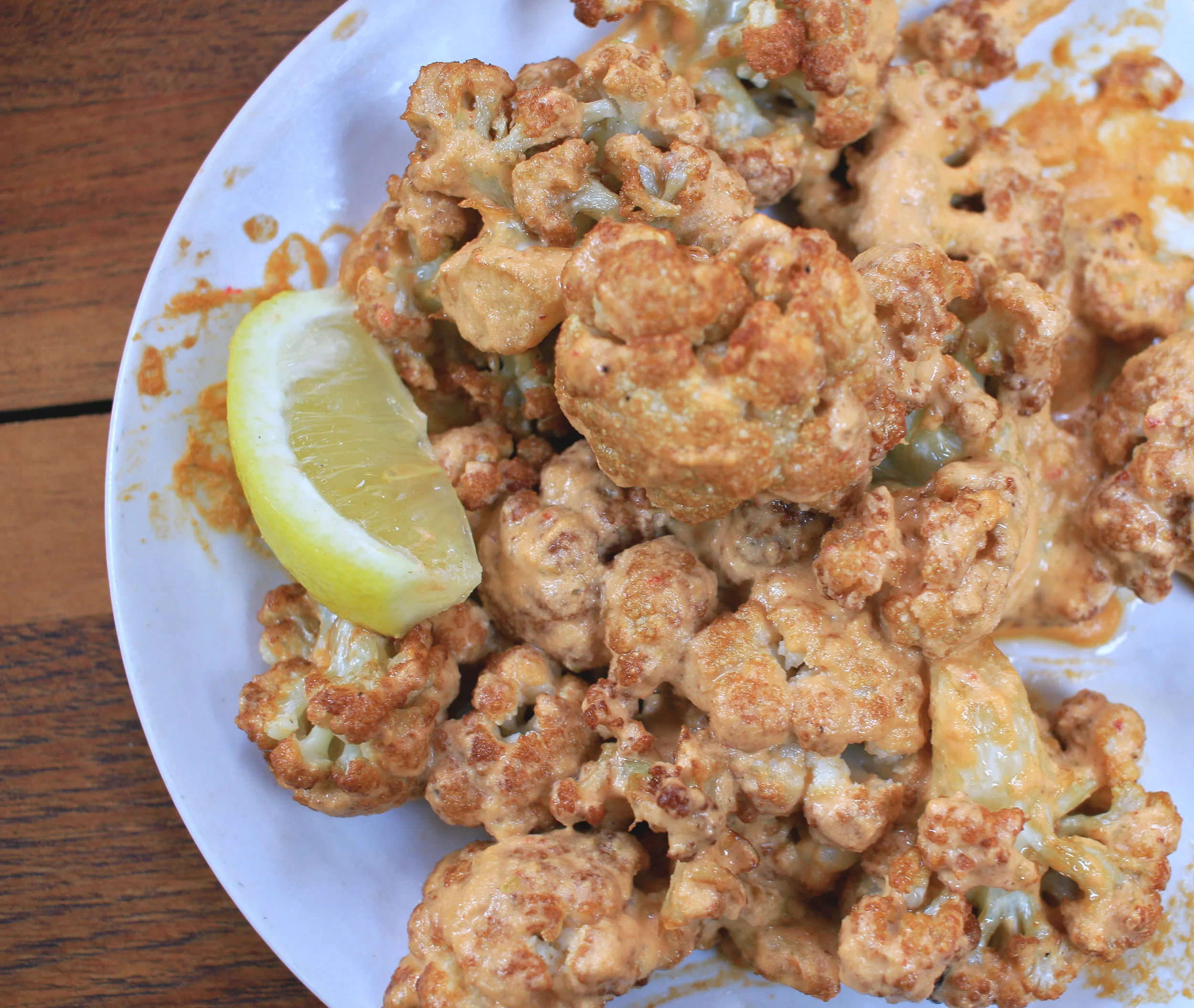Coliflór Frito: cauliflower, cashew nacho cheese, lemon