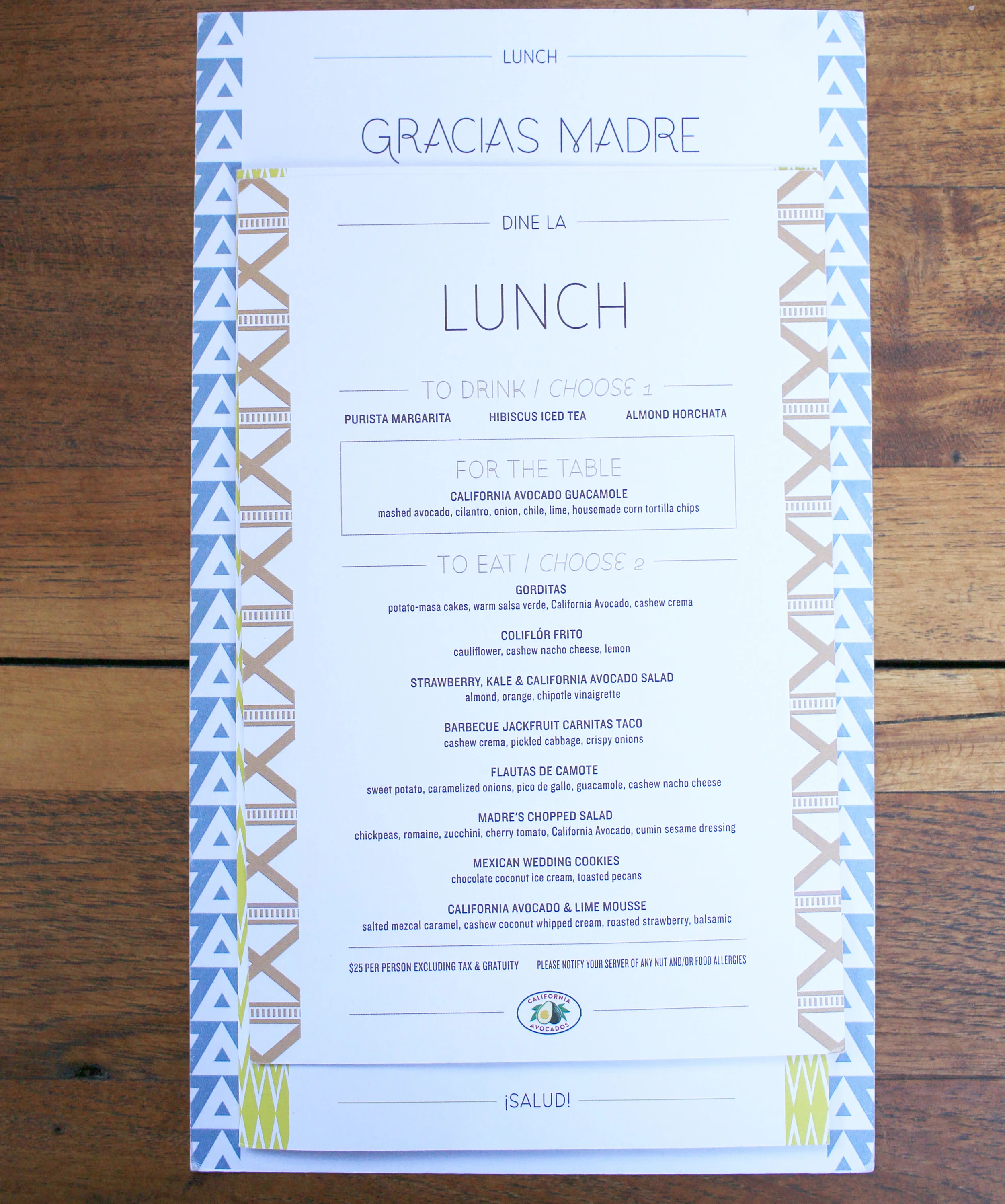 I hope everyone had a great weekend and has been enjoying their summer as much as I have. I have been checking out a bunch of different places throughout California to share with you lovelies lately. Today is one of my favorites I came across in Hollywood off Melrose ave. Having healthier options is still something I am trying to stick to with and Gracias Madre not only has healthy options and all their food is organic, but are known for being a vegan and vegetarian restaurant. I try to not eat meat a lot throughout the week and try to keep one-day meat free for the most part. I was super excited to have lunch at Gracias Madre and catch up with my friend Cassi while doing so. The restaurant offers inside and outdoor seating with bar seating as well. It has a Spanish look to it with beautiful wood tables and white and tile designs. I sat outside with the weather being a beautiful 80 degrees it was the perfect lunch setting. They have a lovely menu with items ranging from salads to tacos and full entrees. They offered a tasting menu for lunch that let me try a little bit of everything. You pick a drink and get chips and guacamole for an appetizer and then two items for your entrée.