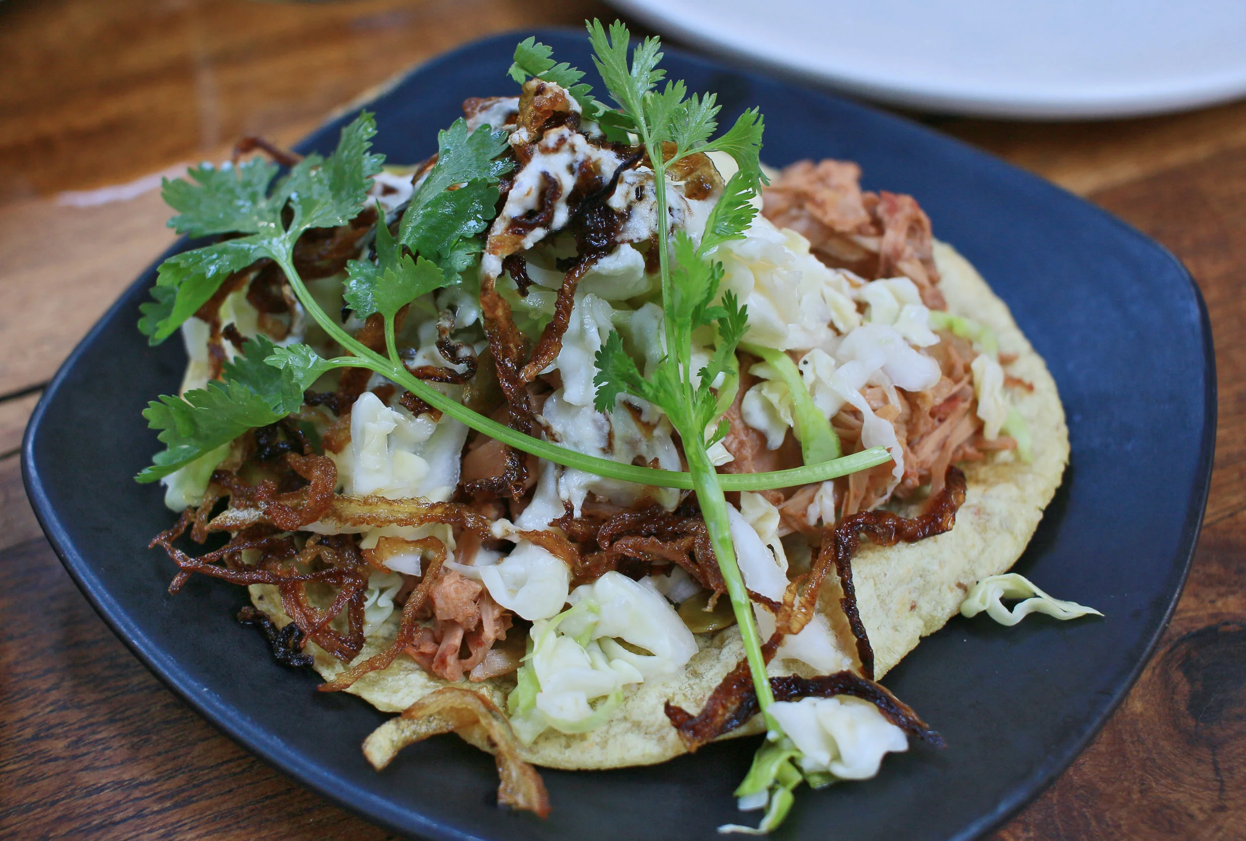 Barbecue Jackfruit Carnitas Taco: cashew crema, pickled cabbage, crispy onions