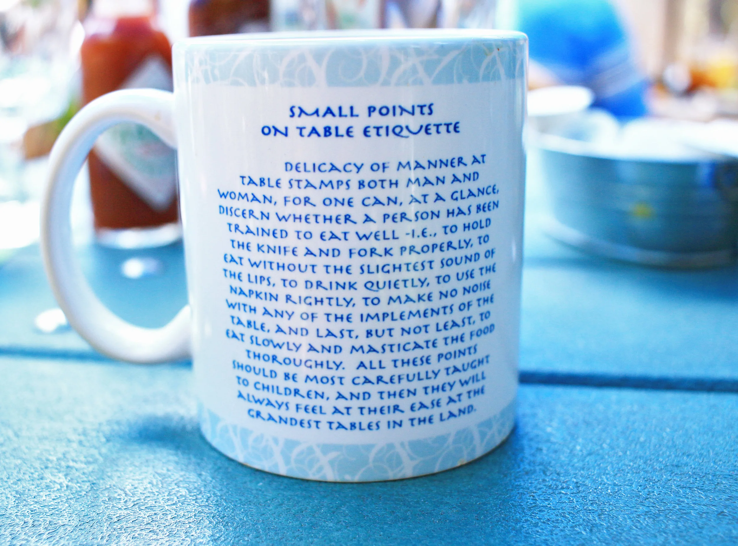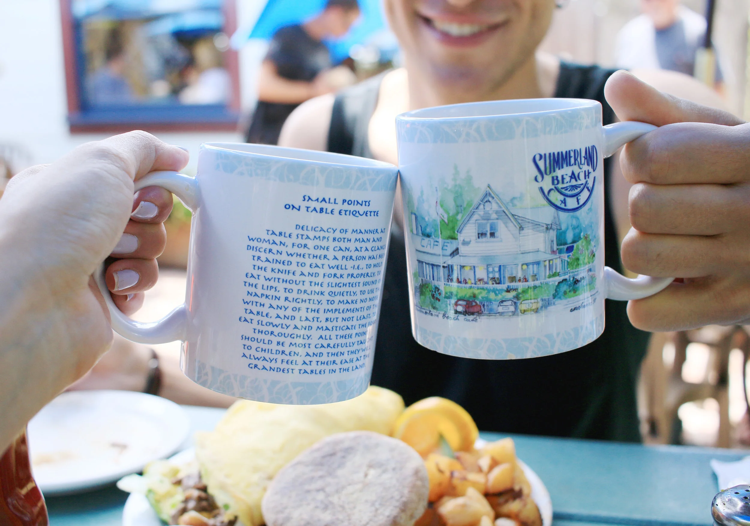 As per my previous posts I love Eggs Benedict and I always have to try it any place I go to for breakfast. At Summerland Beach café I did just that, but a crab Benedict! So delicious! This wasn’t my first time having a crab Benedict, but it was one of the best I have had! The crab meat was so fresh and the flavors all just went together so well with every bite! I enjoyed coffee and water with my meal and to help save water and our planet they only offer bottled Voss water which was only $1 so you won’t break the bank on staying hydrated. The coffee cups had a cute saying on them about table etiquitte and you can purchase them as a souvenir.