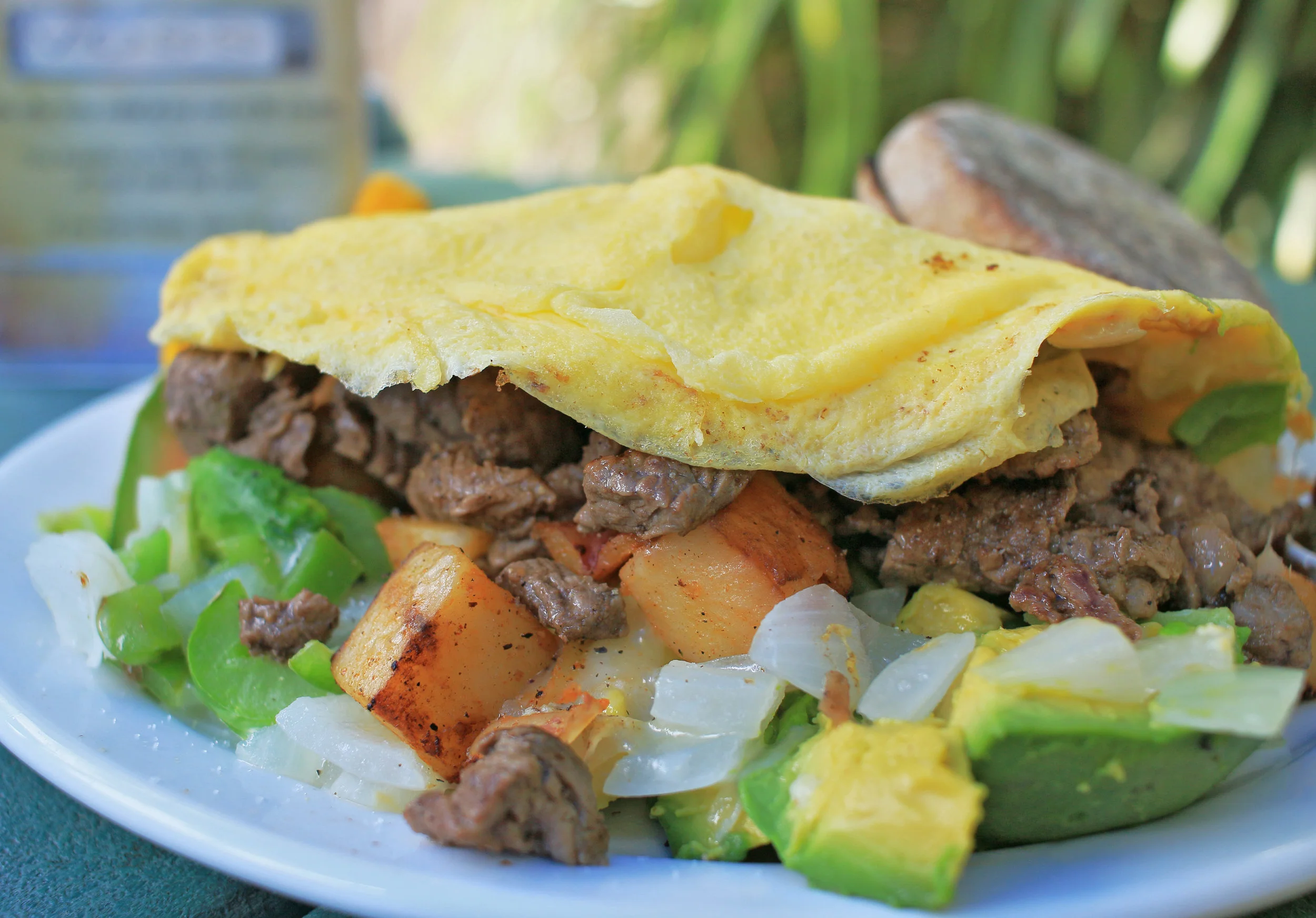Steak Omelet with potatoes, onions, avocado and grilled peppers. A english muffin and potatoes come on the side.