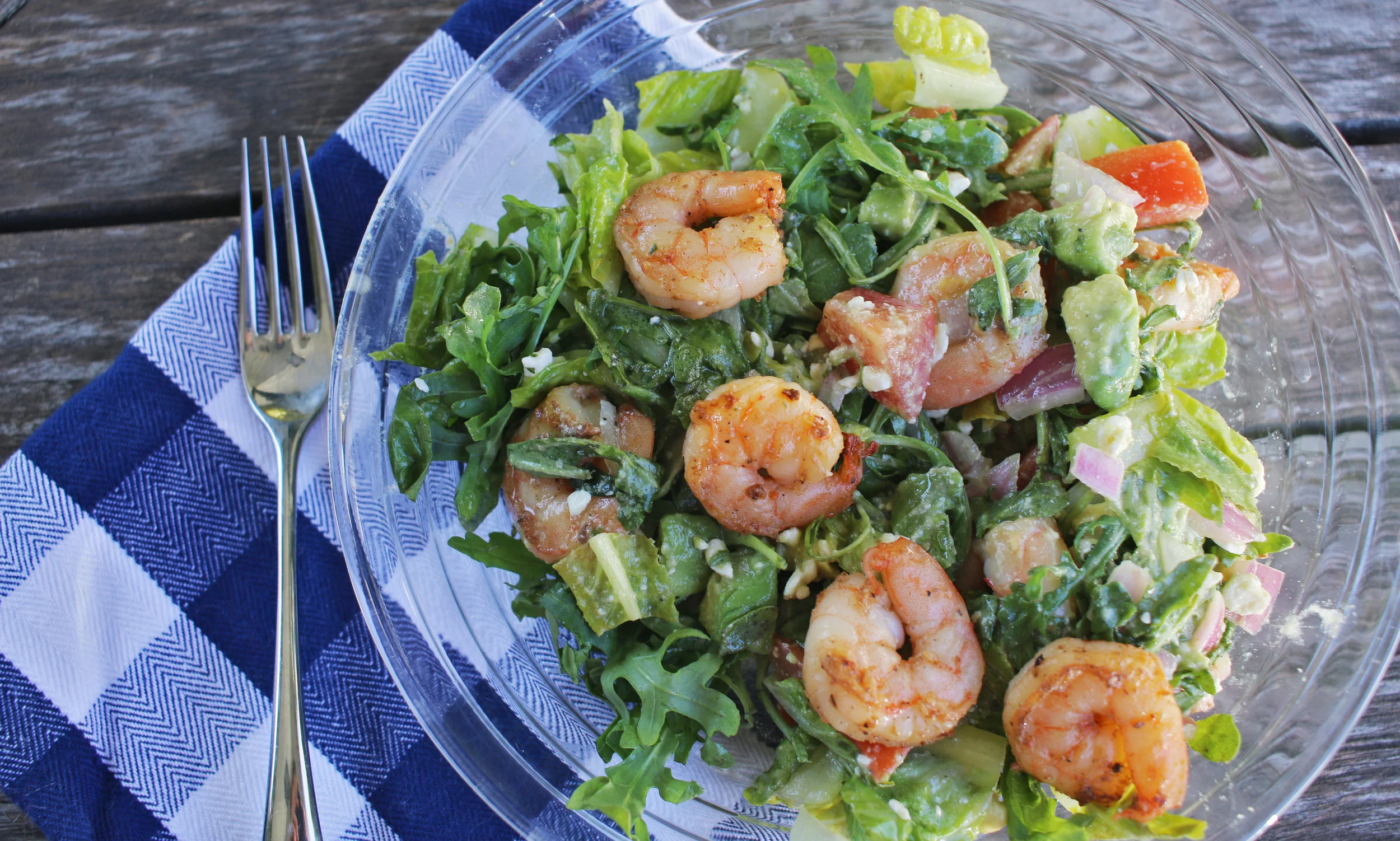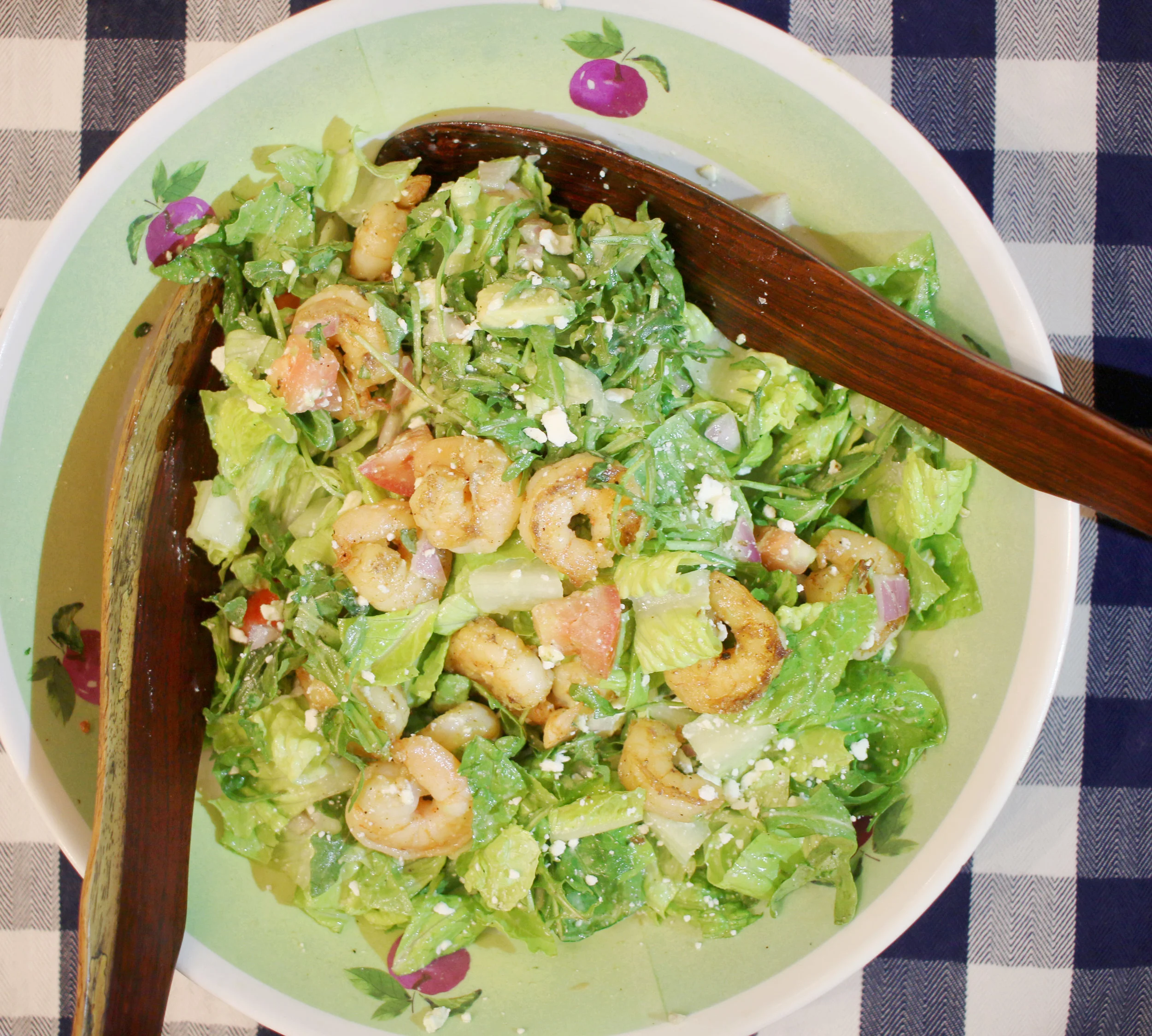 It is almost spring time and that means almost SUMMER!! I am so excited to be living in California this summer! Beach days all the time! I want to make sure I am beach ready and that means changing my diet up. I have lost a lot of weight in the past couple of months since my move all positive progress. I have started to change how I eat and started working out regularly and am trying to live a healthier lifestyle. I plan to be in the best shape I have been in my life so far, I can’t wait to share my fitness journey with you. I will be making a lot healthier recipes to be sharing and also some yummy desert alternatives since I have such a sweet tooth. Today I am going to share this yummy light and protein packed “Shrimp Salad.” I had my girlfriend Ashley over and we made the salad and had a glass of wine… or two… We are working it off in Spin class in the morning, it’s okay! The salad takes maybe 15 minutes all together to prep and make. I sautéed the shrimp in a pan, but grilling it would also be really good as well! The dressing I created just based off of the flavors I used to sauté the shrimp. It all turned out so yummy and we had salad left over for the next day. I was happy to enjoy it again for lunch the following day. I have been drinking a lot of probiotic drinks lately to help my immune system stay strong, I paired this salad with one of my favorites for lunch. I haven’t been sick in over a year and Want to keep it that way. Eating clean will definitely help keep me healthy and fit! I really hope you lovelies like this salad. If you make it please share your thoughts on it, I love feedback! Hope everyone has a wonderful weekend!